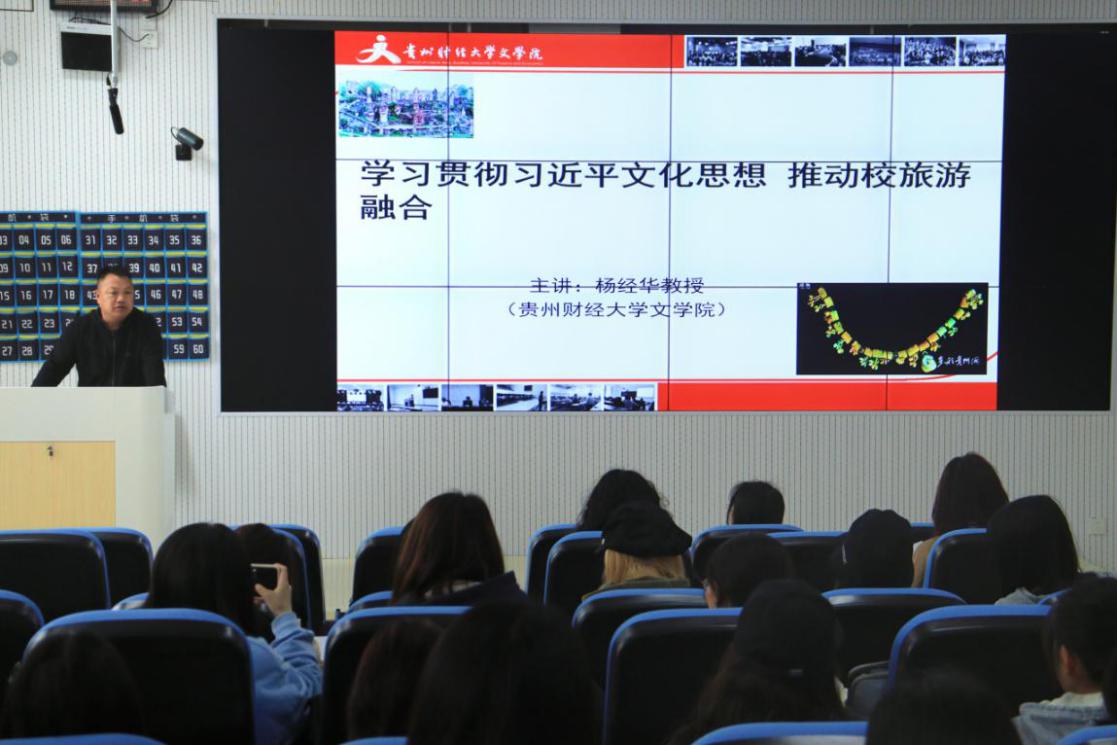开班仪式结束后,杨经华开授第一课《学习贯彻习近平文化思想 推动校旅游融合》。